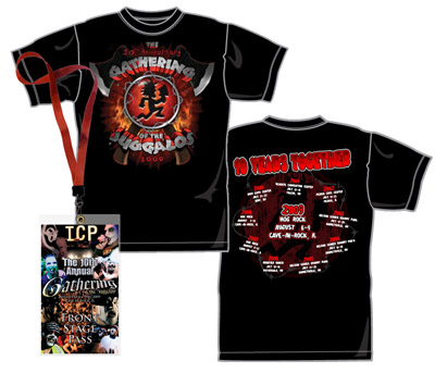 The second option is our new 10th Anniversary Commemorative Pack This fresh bonus bundle starts with an Admission Ticket, but it also includes some fresh flavor you can get with your ticket! First you get a fresh Commemorative Pack Exclusive T-Shirt, which you can rock on your way to the Gathering. The Pack also includes the first-ever Gathering of the Juggalos Deluxe Front Stage Pass! This ballin, sparkly, laminated flavor comes with a printed lanyard. Peep the visuals right here: